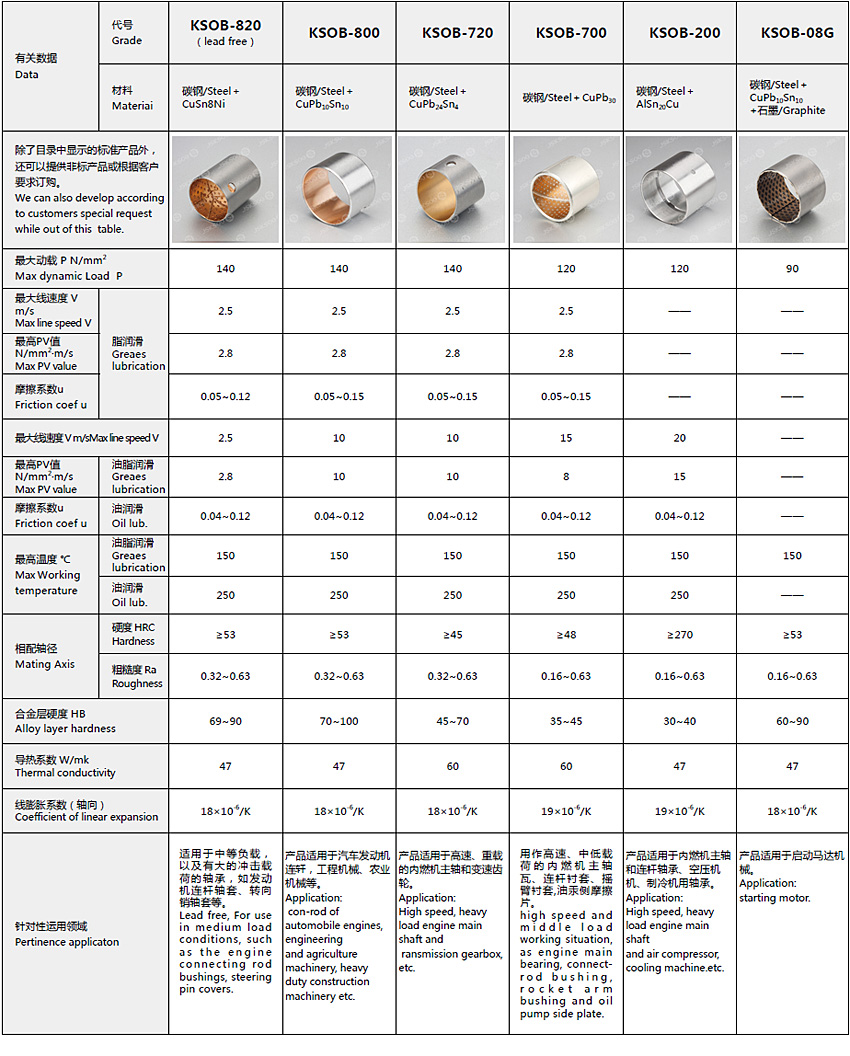 According to the different working conditions, different alloy material (CuPb10Sn10、CuPb6Sn6Zn3、CuPb24Sn4、CuPb30、AlSn20Cu、CuSn8Ni)can be sintered on steel backing. product range includes KSOB-820、KSOB-800、KSOB-720、KSOB-700、KSOB-200、KSOB-08G.