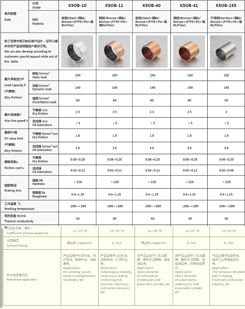 實際運用中根據使用環境、工況和環保要求的不同,低碳鋼板可以改為銅板或不銹鋼板,內表面塑料層可以選擇PTFE 含鉛或者不含鉛材料以及其他高分子填充物,外表可以鍍錫或者鍍銅。產品范圍包括:KSOB-10、KSOB-11、KSOB-40、KSOB-41、KSOB-1SS。